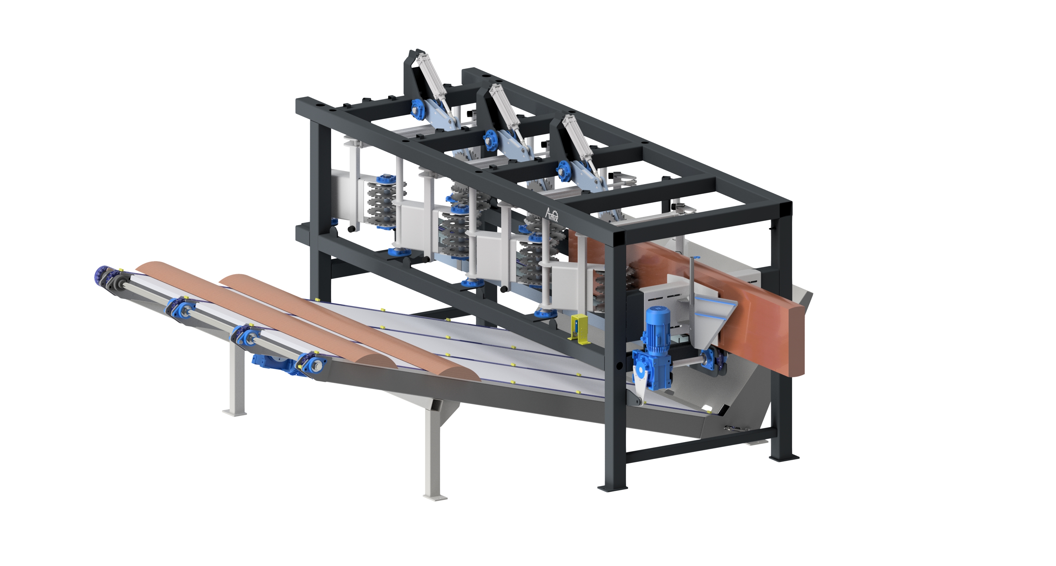 The POR-500 receiving feeder is designed to receive cut logs from the machine line, which are then transported to the next machine line. The upper clamps are designed to press the log against the transport chain, while the side clamps hold the cut material in the correct position. After they are moved aside, the cut material ends up on an inclined chain feeder. In this way, both the stacks and the offcuts are sent for further processing.
